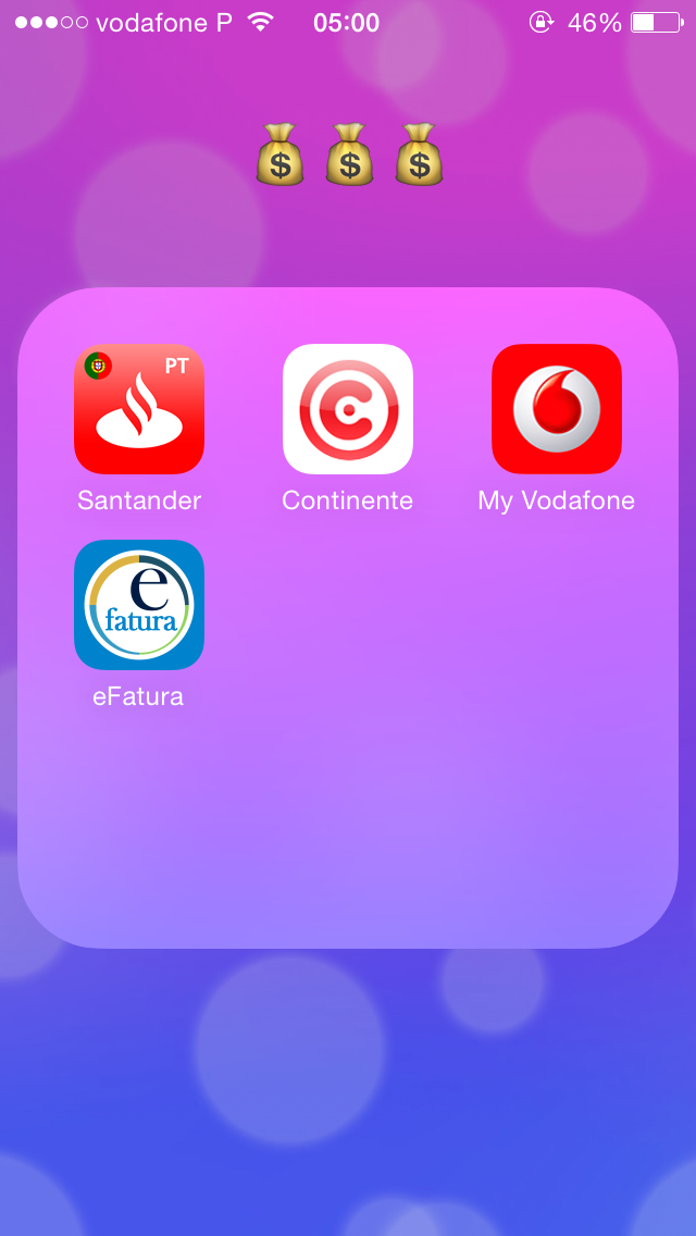 A pasta do dinheiro é a pasta onde tenho a app do meu banco para poder consultar saldo, fazer transferências, pagamentos, etc., a app do continente, para saber sempre que vales tenho, quanto dinheiro tenho no cartão, etc., a app da Vodafone, muito útil para ver quanta net já gastámos e a app da eFatura, conhecida por muita gente!